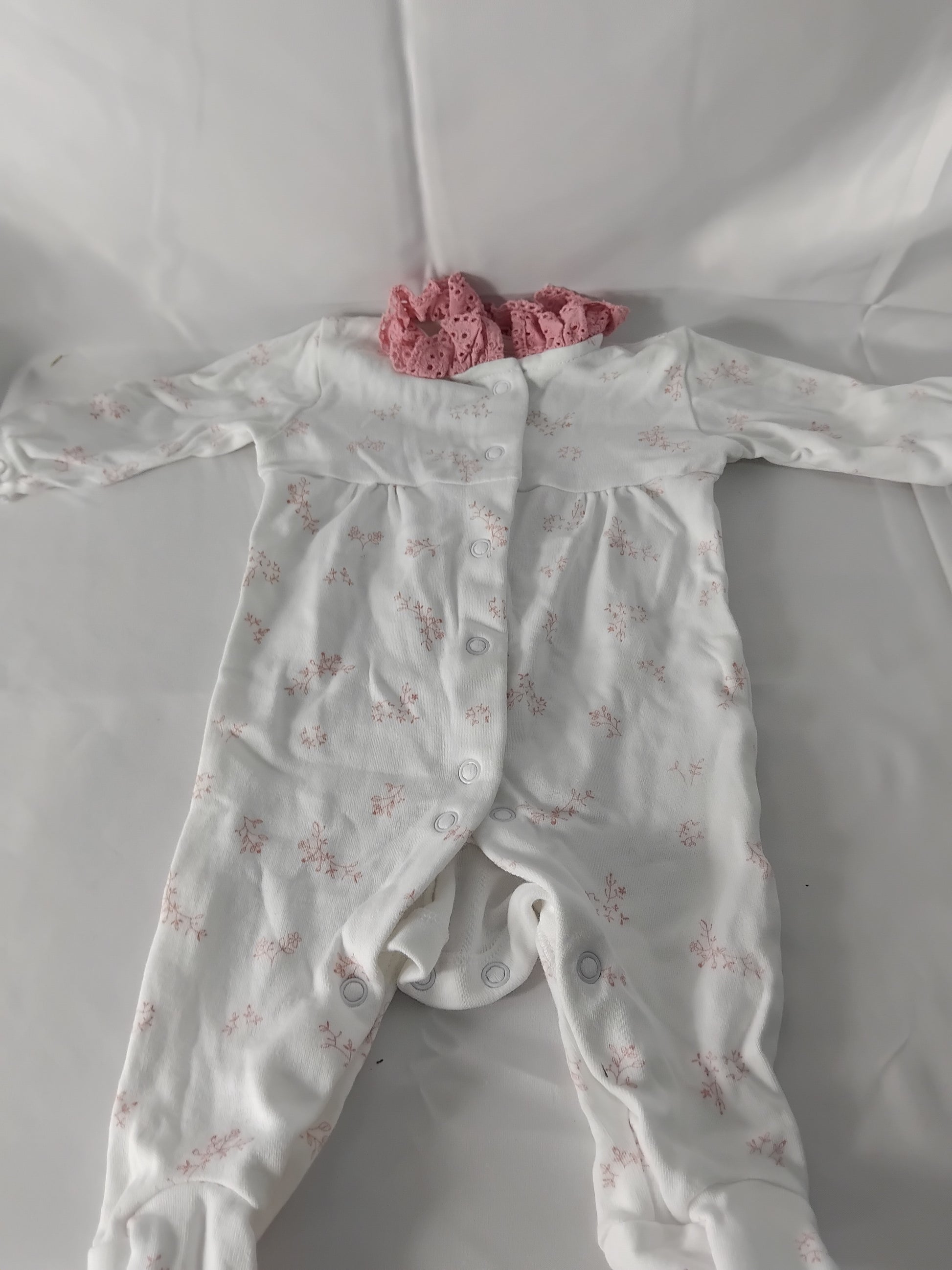 Babies (new born) White babygrow with pink flowers and collar